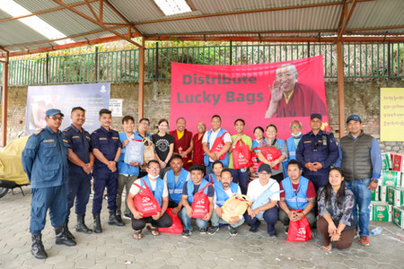 The Dorje Drolo Sadhana (also performed to dispel obstacles and call for the swift return of Thrangu Rinpoche) began May 16 and ended on the 22nd. On the 23rd, after the entire sangha circumambulated the monastery and the Namo Buddha stupa, Marpa Guru Yoga prayers were offered in remembrance and observation of the first anniversary~calling to Rinpoche himself. Rinpoche's statue was then returned by procession to his residence. Later in the afternoon everyone returned to the stupa and recited the Thrangu Guru Yoga. As it was the full moon day of Saga Dawa, a distribution of rice and supplies, arranged jointly by the Hong Kong Vajrayana Center and Tse Hing Wui Care, was made to the local villagers.